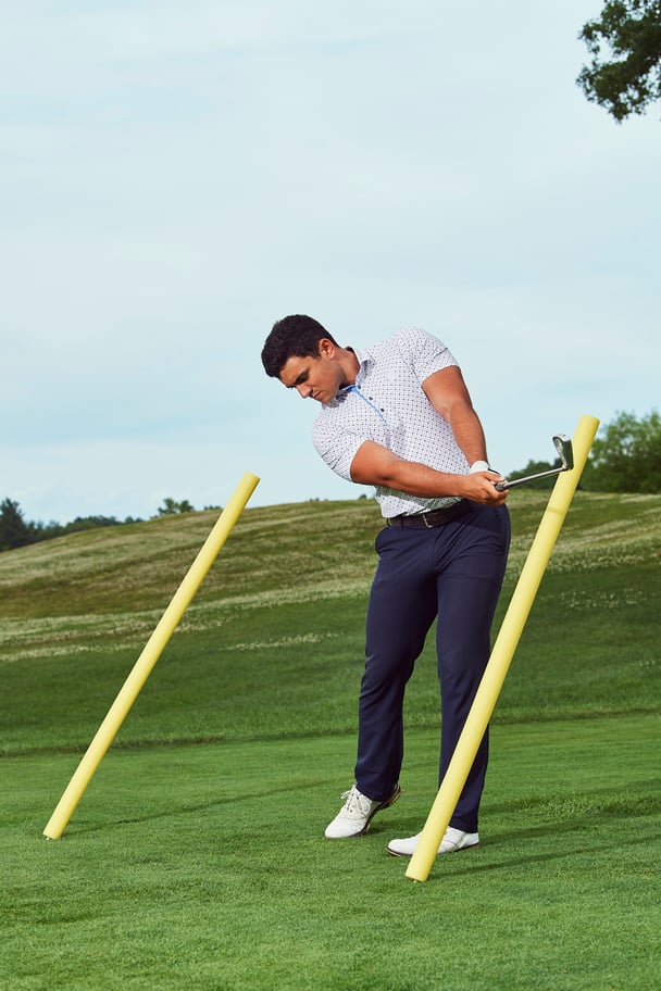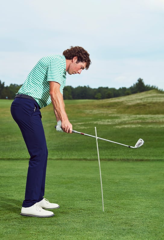 Các trụ điều hướng này sẽ giúp kiểm soát đường swing của bạn ở hai bên của bóng. Mục tiêu là giữ cho trục gậy sắt của bạn bên trong 2 thanh nhựa này và quay ngược trở lại, sau đó đưa nó đi xuống và ở trong khu vực. Bắt đầu bằng cách đánh bóng từ điểm phát bóng và những cú xoay nhỏ, cao từ thắt lưng bên này sang thắt lưng phía bên kia. Quả bóng phải bắt đầu bên phải mục tiêu và quay trở lại mục tiêu.