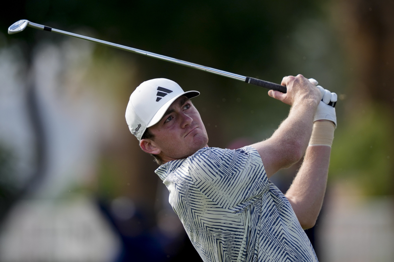 Nick Dunlap dõi theo cú phát trên hố 4 vòng cuối American Express trên sân Pete Dye ở La Quinta, California, Mỹ ngày 21/1. Ảnh: AP