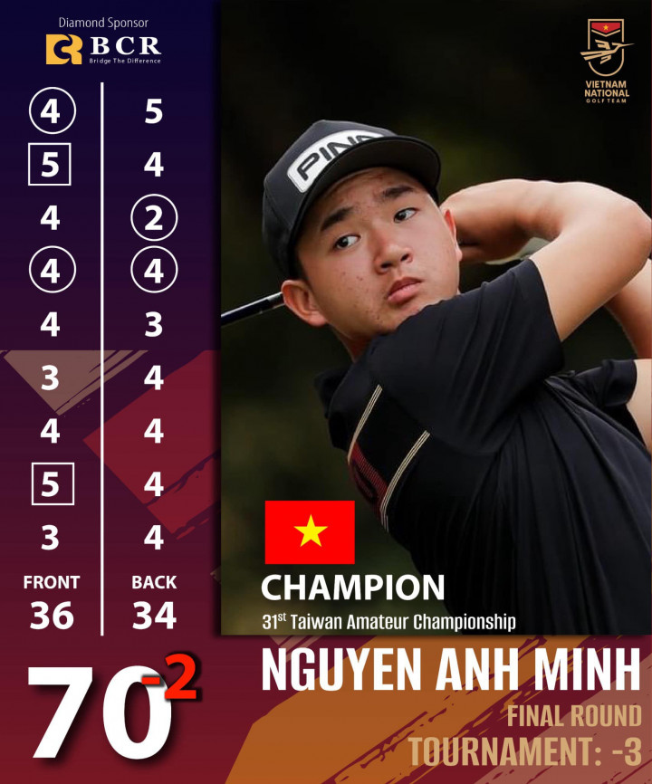 Với kết quả (-2) trong vòng 4, Nguyễn Anh Minh đã chính thức vinh dự với tổng điểm (-3) và đăng quang tại Taiwan Amateur Golf Championship 2024. Đây là một chiến thắng đầy ý nghĩa và sẽ là động lực lớn giúp Anh Minh tiếp tục vươn xa hơn trong sự nghiệp Golf của mình.