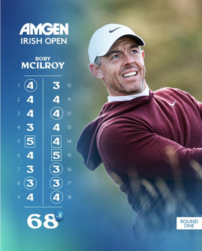 Rory McIlroy đã có màn khởi đầu ấn tượng tại Amgen Irish Open 2024, giải đấu thuộc hệ thống DP World Tour diễn ra trên sân Royal County Down Golf Club, quê hương của anh. Mười một ngày sau khi xếp đồng hạng 9 tại Tour Championship, McIlroy tiếp tục thi đấu mạnh mẽ với 68 gậy (-3) trong vòng đầu tiên của giải.