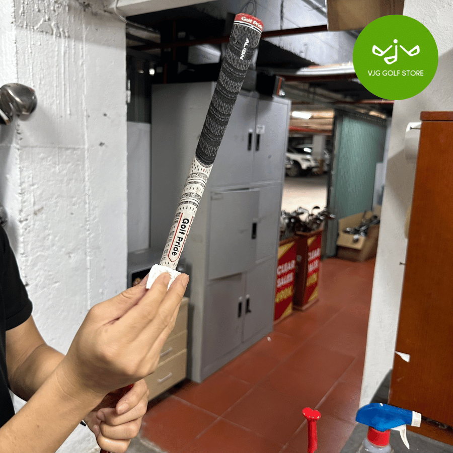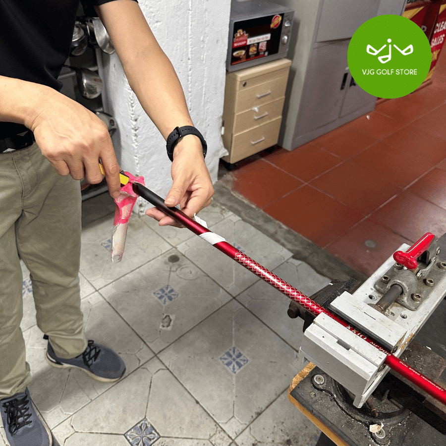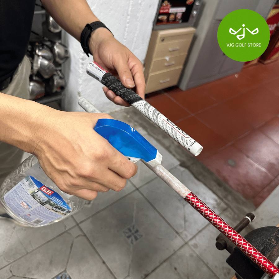 Bước 2: Dùng băng keo chuyên dụng gắn vào shaft gậy, sử dụng dung môi để dễ dàng đưa grip mới vào vị trí.